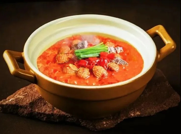 用料:鲍鱼10个、嫩豆花300克、泡椒酱25克、泡椒段25克、泡姜米10克、蒜米10克、小葱节2克、胡椒粉1克、凯里酸汤200克、鸡精适量、泡椒油30毫升、鲜汤、水淀粉、花椒油各适量。烹饪步骤:先将鲍鱼洗净改花刀,沸水锅煮断生,捞出备用。在将豆花入水锅煮透,然后垫在烧烫的沙锅里。锅上火入泡椒油烧热,加入泡椒酱、泡椒段、泡姜米、蒜米炒香,加入鲜汤,下入压好的鲍鱼。调入鸡精、胡椒粉、凯里酸汤,待鲍鱼烧入味后勾芡,淋入花椒油,起锅倒入沙锅,撒小葱节即可