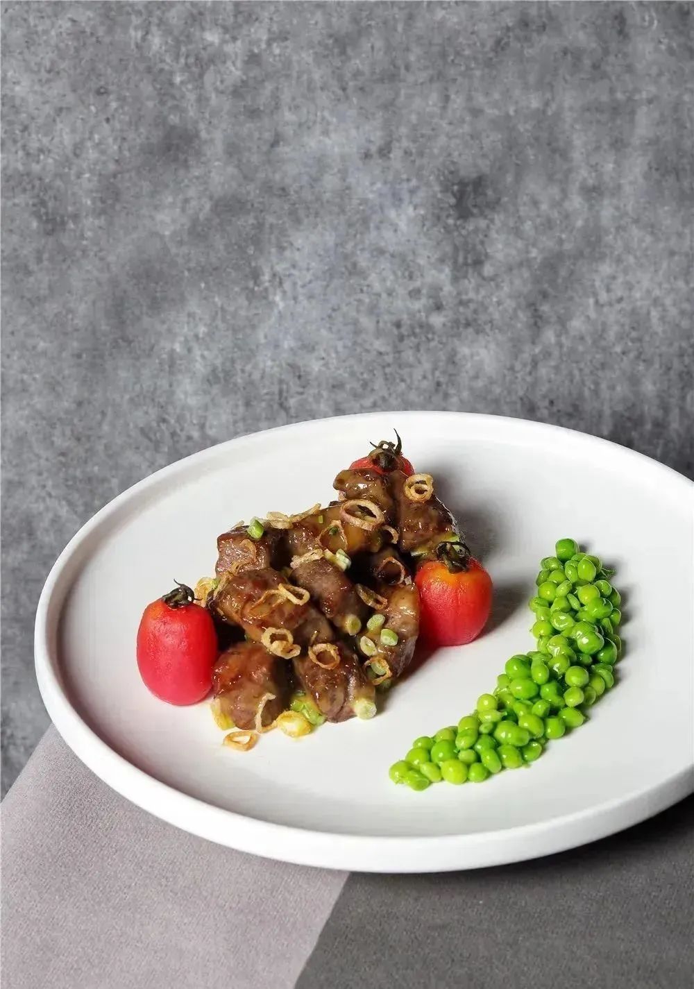 3、锅入少量油,下入牛肉粒小火煎熟。牛肉煎熟后,倒去多余油份,下入蒜仔,野葱翻炒,最后加入黑胡椒汁、生抽调味即可。