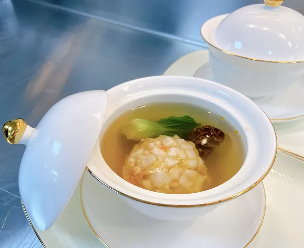 4、取一个汤盅将狮子头放入,浇入鸡汤,加入羊肚菌,放入蒸箱蒸20分钟,出菜放入菜胆后即可出品!