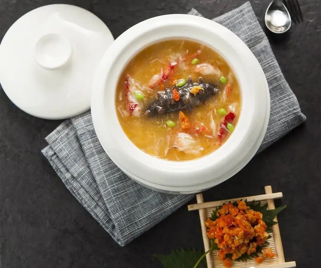 补充:此处的葱烧海参与传统制法不同,不加酱油煨制。