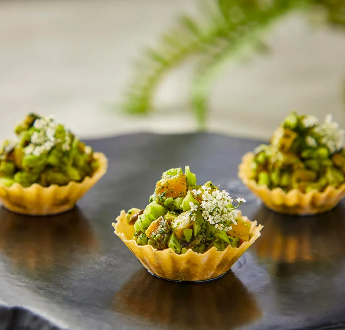 青麻香椿酱 [[ 鸡粉8克 青花椒麻辣酱5克. 烫熟菠菜65克 烫熟香椿35克 油30克 糖2克 盐1克 ]]制作:1、将田螺放入清水中,加入少量盐和几滴香油,浸泡2 - 3小时,让田螺吐尽泥沙。把浸泡好的田螺取出,用刷子将外壳刷洗干净,然后剪去尾部,取出螺肉。将螺肉放入清水中,加入适量的白醋和淀粉,轻轻揉搓,去除表面粘液,再用清水冲洗干净。锅中加入适量清水,放入葱姜段、15 - 20毫升花雕酒和2 - 3克盐(底味),大火烧开后转小火,放入田螺肉汆熟,时间大约3 - 5分钟。捞出后立即放入冰水中冷却,沥干水分备用。2、蚕豆瓣洗净,用厨房纸巾吸干表面水分。锅中加入适量清水,放入1 - 2克小苏打和1 - 2克盐,大火烧开后转小火,放入蚕豆瓣汆烫1分钟。捞出后立即放入冰水中冷却,沥干水分备用。酱料及塔壳制作取适量烫熟香椿切碎,放入碗中。将春卷皮刻成塔壳皮形状。把塔壳皮放入模具中,二层压一片,放入预热至180度的烤箱中,烤制10分钟,直到塔壳成型且表面金黄。取出后放在晾架上冷却备用。组合装盘1. 将螺肉和蚕豆瓣分别切成小粒,大小尽量均匀,例如螺肉切成0.5厘米见方的小粒,蚕豆瓣切成0.3 - 0.4厘米见方的小粒。2. 把切好的螺肉粒和蚕豆瓣粒放入碗中,加入剩余的青麻香椿酱(根据个人口味调整用量),搅拌均匀。3. 将拌好的馅料装入烤好的春卷皮塔壳中,用烫熟菠菜和食用花进行点缀即可。