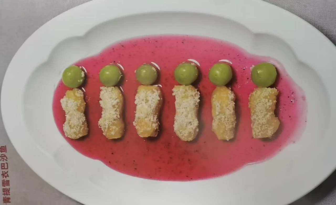 制作人:张永健 口味:酸甜适中,颜色红亮主料:巴沙鱼1条脆皮浆比例:百味佳脆炸粉70克,生粉40克,淀粉20克,泡打粉3克,清水110克,色拉油45克(混合搅拌均匀即可)胭脂汁:红心火龙果25克,海天苹果醋150克,白糖65克,浓缩橙汁6克(混合放入榨汁机中搅拌均匀,上锅勾少许的薄芡即可)配料:阳光葡萄8个,夏威夷果适量制作流程:1、首先把巴沙鱼切成条状,然后控干水份备用。2、接下来锅中烧油把油温烧制5~6成热,然后把切好的巴沙鱼沾一成干生粉,再裹上调好的糊,下锅炸制金黄酥脆捞出,放入一个盘中每个上面撒上夏威夷果碎。3、然后把调好的腌制汁铺到盘中,再把炸好的巴沙鱼摆盘,最后点缀青提即可。注意事项:1、巴沙鱼的鱼块不要切的太大!2、炸鱼的时候一定要注意先拍干粉,然后再去裹糊去炸,因为巴沙鱼的水分特别的大,直接裹糊容易脱落。